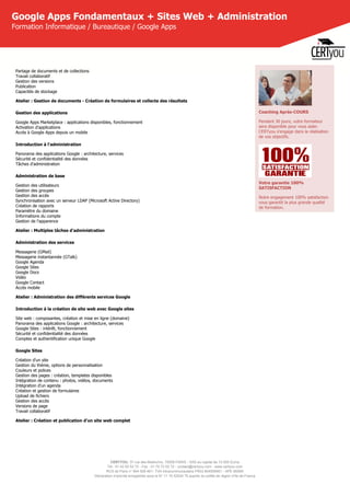 Le document présente une formation de 5 jours sur les fondamentaux de Google Apps, abordant l'utilisation des applications, l'administration, et la création de sites web. Il inclut des détails sur le programme de formation, les prérequis, ainsi que les dates et lieux des sessions. La formation garantit un suivi personnalisé et la satisfaction des participants.