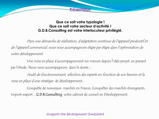 G.D.B. Consulting propose un accompagnement sur mesure pour l'optimisation du développement des entreprises, en offrant des services tels que des audits, des stratégies marketing, et des études de marché. L'entreprise se concentre sur la conquête de nouveaux marchés, tant nationaux qu'internationaux, tout en s'assurant d'adapter les besoins de ses clients grâce à des experts de haut niveau. À travers une approche collaborative, G.D.B. Consulting intègre des solutions de financement, de gestion des risques et de formation pour les collaborateurs.