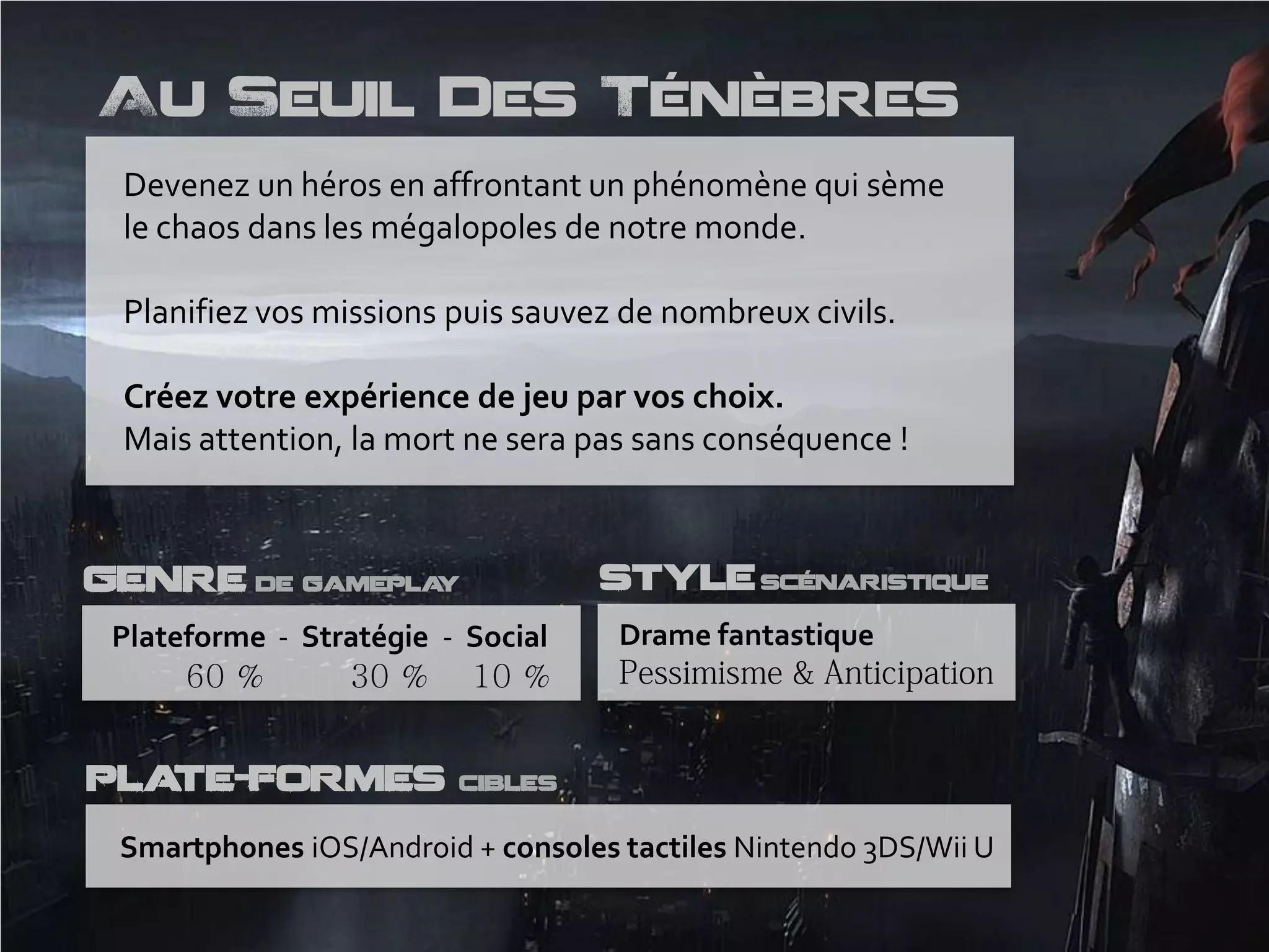 Le document présente un jeu vidéo où les joueurs deviennent des héros en combattant un phénomène chaotique dans un futur dystopique. En mettant l'accent sur la dualité entre liberté et contraintes, le jeu propose une expérience immersive à travers des choix stratégiques, une narration dramatique et des éléments de gameplay inattendus. Le projet a été sélectionné pour participer au concours 'hits playtime' et utilise les réseaux sociaux pour interagir avec sa communauté.