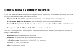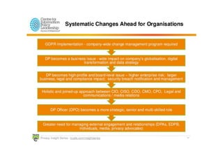 Le document aborde l'importance du contexte organisationnel pour la mise en œuvre réussie du GDPR, mettant en avant les changements rapides des environnements de travail et la nécessité d'adapter la culture d'entreprise face à ces défis. Il souligne également le rôle essentiel du DPO et les défis liés à la sécurité des informations personnelles, tout en mentionnant les évolutions requises dans le recrutement et la formation au sein des organisations. Enfin, il évoque les tensions entre sécurité des données et contrôles imposés aux employés dans un paysage numérique en constante évolution.