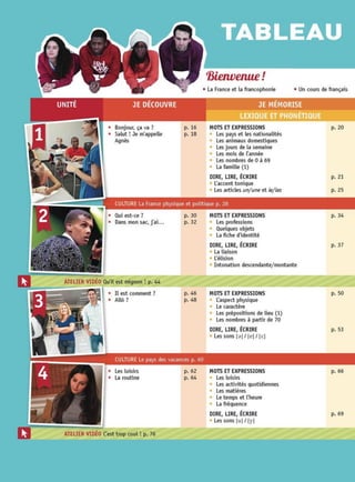 Le document est un cours de français destiné à l'apprentissage des bases de la langue, couvrant des sujets tels que les présentations, la grammaire, le vocabulaire du quotidien, et la culture francophone. Il inclut des exercices pratiques, des dialogues et des informations sur la Francophonie, des pays francophones et des personnalités importantes. Ce cours est structuré en plusieurs leçons et thématiques, mettant l'accent sur la compréhension orale et écrite.