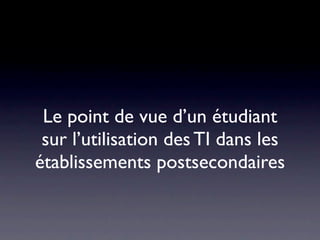 Le document aborde la perspective d'un étudiant sur l'utilisation des technologies de l'information (TI) dans les établissements postsecondaires et met en évidence l'évolution de l'accès, de la communication et de la production de l'information. Il soulève également des questions sur les compétences que les étudiants doivent développer face aux défis d'un flux d'informations rapide et aux usages variés des TI. Enfin, il s'interroge sur l'efficacité des TI pour préparer les étudiants à la société du savoir.