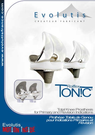Le document décrit les prothèses totales de genou Rolflex Tonic, indiquées pour les arthroplasties primaires et les révisions, en précisant les matériaux utilisés et les options disponibles. Ces implants sont classés comme dispositifs médicaux et peuvent être remboursés par l'assurance maladie sous certaines conditions. Des instructions détaillées sur l'utilisation et la technique opératoire sont fournies aux chirurgiens via des ressources téléchargeables sur le site de l'entreprise.