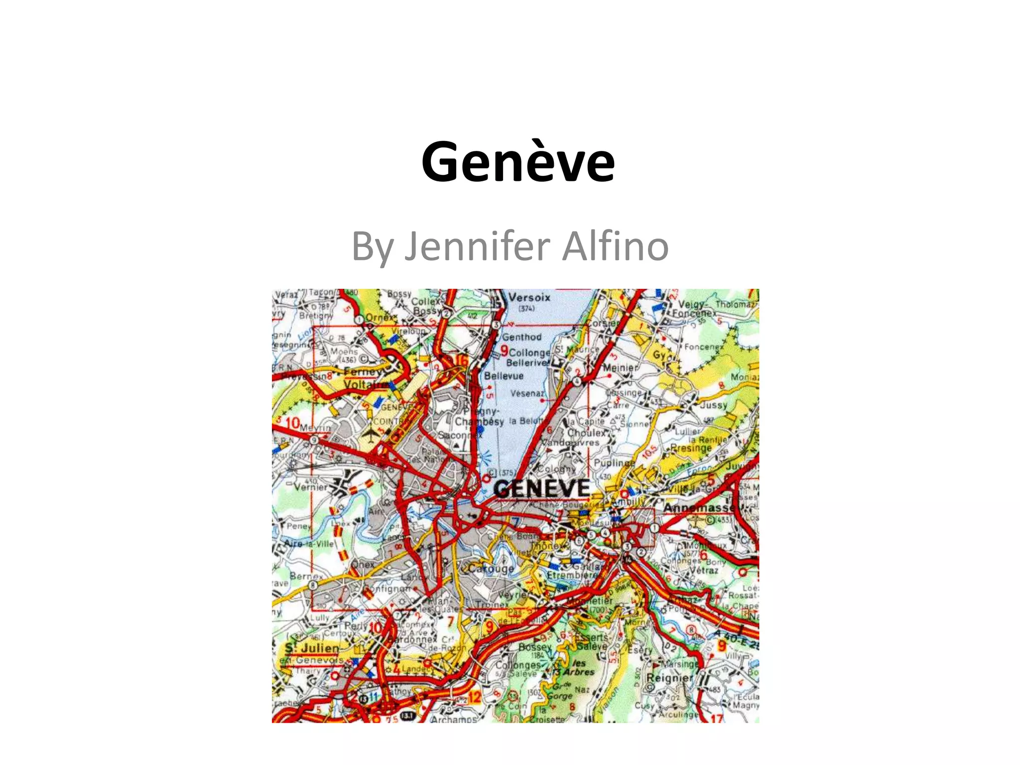 Genève, la deuxième ville la plus peuplée de Suisse, se situe sur le lac Léman et abrite plus de 200 nationalités. La ville est un centre international, hébergeant des organisations telles que l'ONU et l'OMS, et possède des attractions touristiques notables comme le jet d'eau et le palais des nations. Le climat hivernal est froid avec un ensoleillement rare.