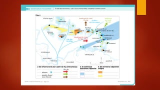 Le document aborde les dynamiques territoriales et les tensions liées à la mondialisation, notamment à travers des concepts tels que la chaîne de valeur et la métropolisation. Il analyse les inégalités d'intégration à la mondialisation, les coopérations et régulations nécessaires ainsi que les critiques de ce modèle. En particulier, il se concentre sur le rôle de la France en tant que puissance mondiale, son rayonnement international et sa capacité d'attraction.