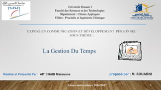 Le document traite de la gestion du temps, en abordant son importance pour l'efficacité et la productivité, tout en présentant les outils et techniques nécessaires pour l'optimiser. Il distingue entre l'urgence et l'importance, tout en expliquant les maladies liées à une mauvaise gestion du temps et les remèdes possibles. Des méthodes telles que la matrice d'Eisenhower, le diagramme de Gantt et la méthode ABCDE sont proposées pour aider à prioriser et organiser les tâches.