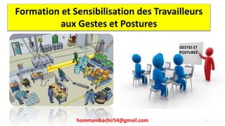 Ce document concerne la formation et la sensibilisation des travailleurs aux gestes et postures sécuritaires liés à la manutention manuelle et mécanique. Il présente les risques associés à cette activité, les principes de sécurité, ainsi que des statistiques d'accidents de travail et des réglementations en matière de sécurité. L'objectif est de développer une culture de sécurité au sein des entreprises pour prévenir les troubles musculo-squelettiques et d'autres accidents.