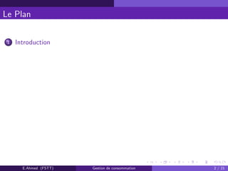 Le document présente un projet réalisé par Ahmed Elatari sur la gestion de la consommation d'eau et d'électricité pour une société de distribution. Il décrit l'analyse des besoins, la modélisation avec la méthode Merise, et les technologies utilisées, notamment le langage C++ et divers outils de développement. Enfin, il souligne l'importance de la gestion des factures et des consommations des clients.