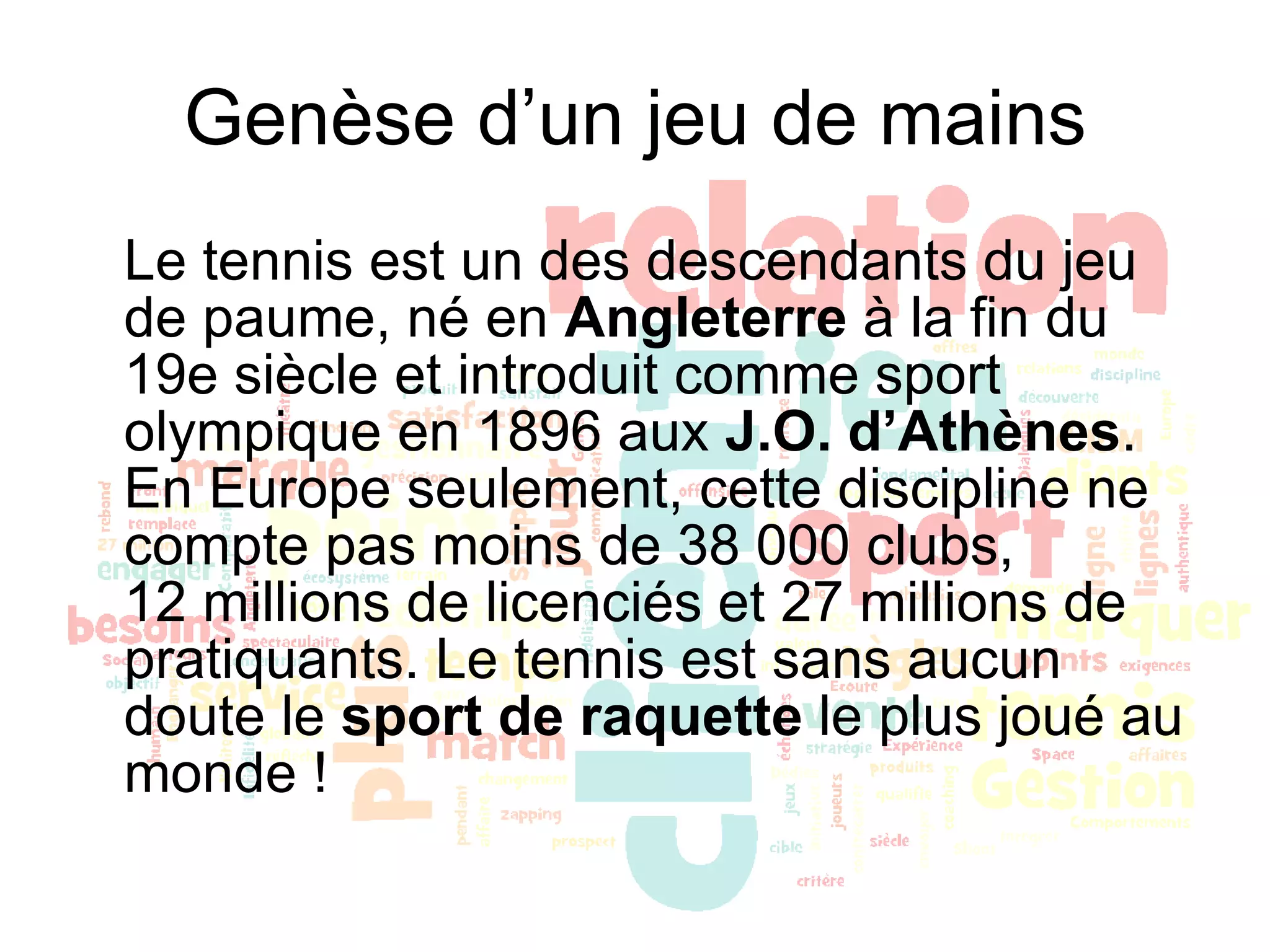 Le document présente une analyse du tennis, ses règles et techniques, ainsi que son évolution en tant que sport majeur au niveau mondial. Il établit également des parallèles entre la gestion de la relation client et le tennis, soulignant l'importance de l'interaction, de la prise de décision rapide et de l'approche centrée sur le client. Enfin, il discute des enjeux contemporains de la relation client, mettant l'accent sur la personnalisation et l'authenticité des échanges.