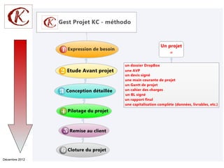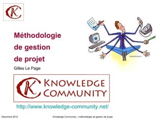 Le document présente une méthodologie de gestion de projet développée par Gilles Le Page en décembre 2012. Il décrit les moyens et les livrables associés à cette méthodologie. L'objectif est d'améliorer l'efficacité des projets au sein de la communauté de connaissance.