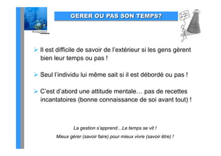 La gestion du temps est une compétence essentielle qui nécessite une bonne connaissance de soi et une attitude mentale adéquate. Le document décrit trois composantes clés de la gestion du temps : l'organisation, l'action et la mesure, tout en soulignant l'importance de l'alignement entre ses valeurs personnelles et ses objectifs professionnels. Il propose également des outils de réflexion et d'auto-évaluation pour aider les individus à améliorer leur efficacité dans l'utilisation de leur temps.