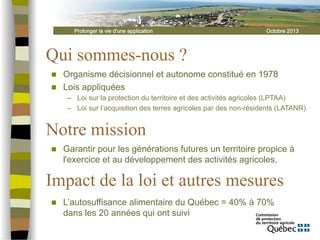 Le document présente l'organisme responsable de la protection du territoire agricole du Québec, sa mission et son historique, ainsi que des informations sur les technologies utilisées pour la gestion des données agricoles. Il aborde les évolutions technologiques, notamment la migration vers PostgreSQL et l'intégration de systèmes d'imagerie numérique, tout en évoquant les partenaires et l'avenir de l'application. Les efforts en cours visent à garantir la pérennité de l'application et l'amélioration des outils disponibles pour la gestion des ressources agricoles.