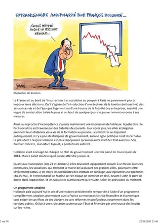 La France est au bord de l'insurrection avec un gouvernement socialiste qui peine à imposer ses mesures face à l'opposition croissante et une impopularité record de François Hollande. La politique économique du pays est critiquée comme étant désastreuse, et les prévisions électorales suggèrent un échec imminent pour le Parti socialiste. Les tensions internes au sein du gouvernement et le mécontentement populaire alimentent un climat de crise à l'approche des élections municipales.