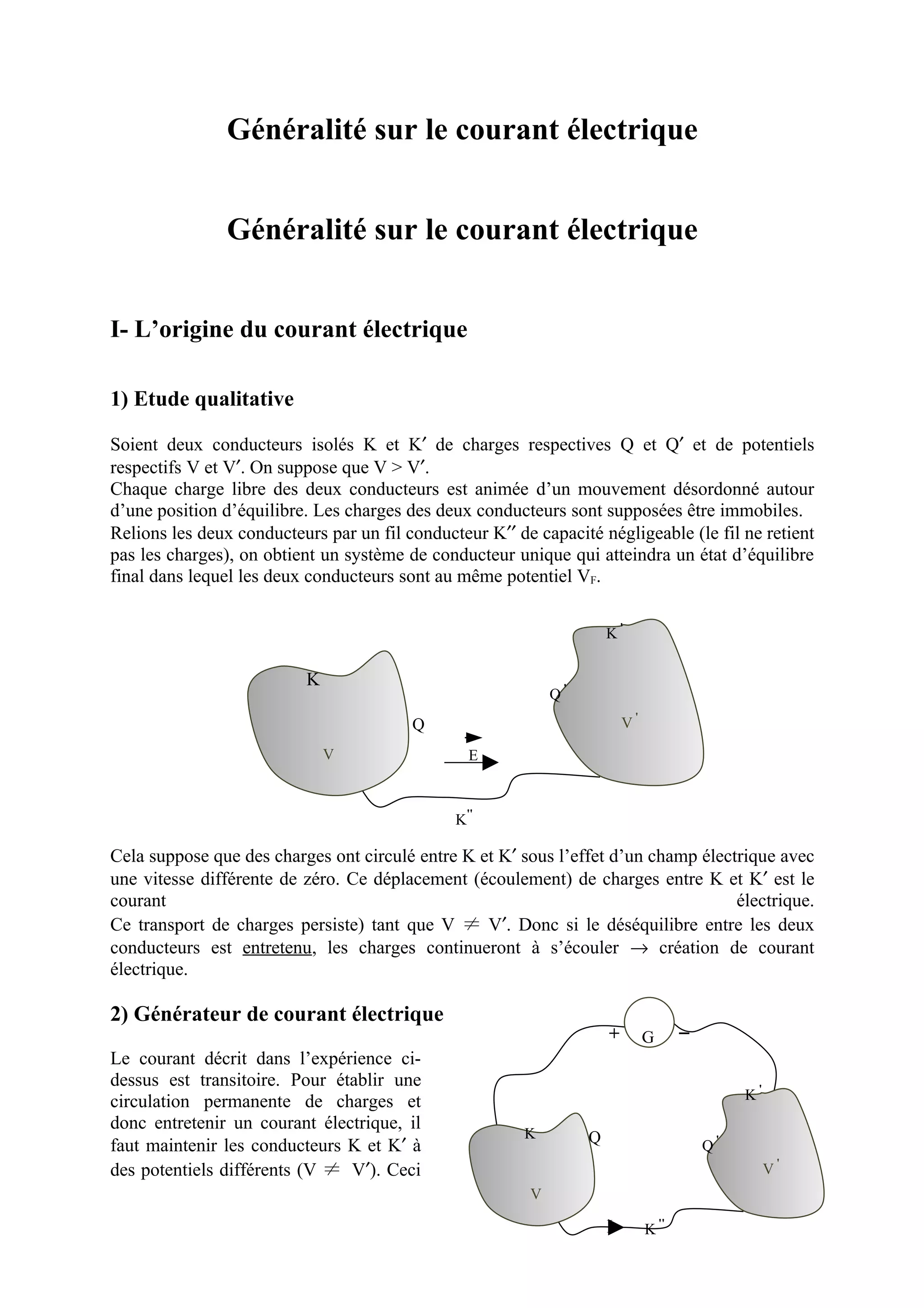 Ce document présente les principes fondamentaux du courant électrique, en expliquant son origine à travers le mouvement des charges entre conducteurs de potentiels différents. Il décrit également les générateurs de courant et les définitions d'intensité et de densité du courant, ainsi que les lois de conservation des charges et le régime permanent. En outre, il évoque la première loi de Kirchhoff relative à la conservation de l'intensité dans un circuit.