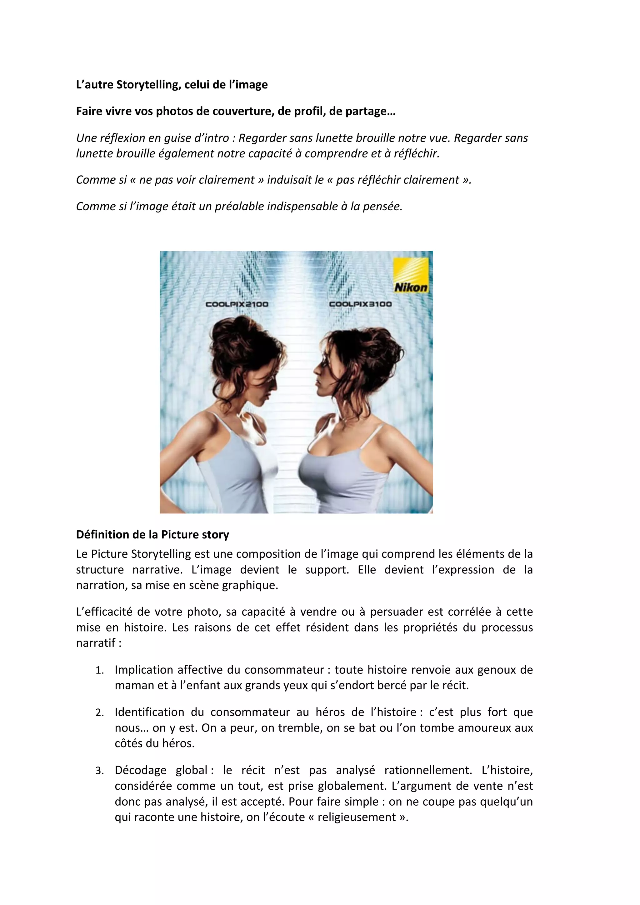 Le document présente le concept de 'picture storytelling', qui utilise des images pour narrer une histoire en intégrant des éléments narratifs structurés. Il décrit sept nœuds essentiels qui transforment une image en récit, soulignant l'importance de l'implication émotionnelle du consommateur et l'identification au héros. L'efficacité d'une image réside dans sa capacité à être interprétée comme un tout et à susciter une réaction sans analyse rationnelle.