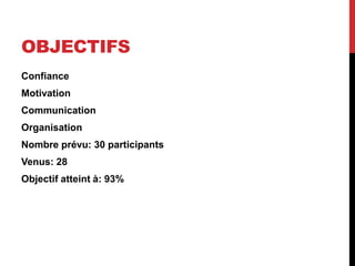 L'événement de team building à Tokyo, organisé par Rovaniaina Ramarojaona, a réuni 28 participants et a atteint 86,7% de ses objectifs. Les activités ont favorisé la confiance et la communication, avec un budget dépassé de 9 000 MGA, entraînant une perte de 39 000 MGA. Les participants ont pris conscience de leur rôle au sein de l'équipe et ont apprécié l'aspect ludique de l'événement.