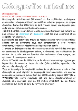 La définition de la ville est complexe et varie selon les disciplines, avec des critères comme le nombre d'habitants et les fonctions économiques. L'évolution urbaine est marquée par deux révolutions majeures : la révolution agraire du néolithique et la révolution industrielle du 19ème siècle, qui ont façonné l'existence et la fonction des villes. Le développement urbain est également influencé par des facteurs naturels et traditionnels, ainsi que par des modèles d'extension comme l'agglutination et l'extension poly-nucléaire.
