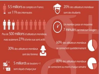 Google+ est un réseau social lancé par Google en 2011, visant à créer une plateforme de communication et de partage d'informations. Ses fonctionnalités incluent des cercles de confidentialité, des communautés thématiques, et des outils de visioconférence comme les hangouts. Bien qu'il ait réussi à attirer des utilisateurs, il reste en retrait par rapport à Facebook, mais offre des avantages pour les entreprises en termes de visibilité et d'interaction avec les clients.