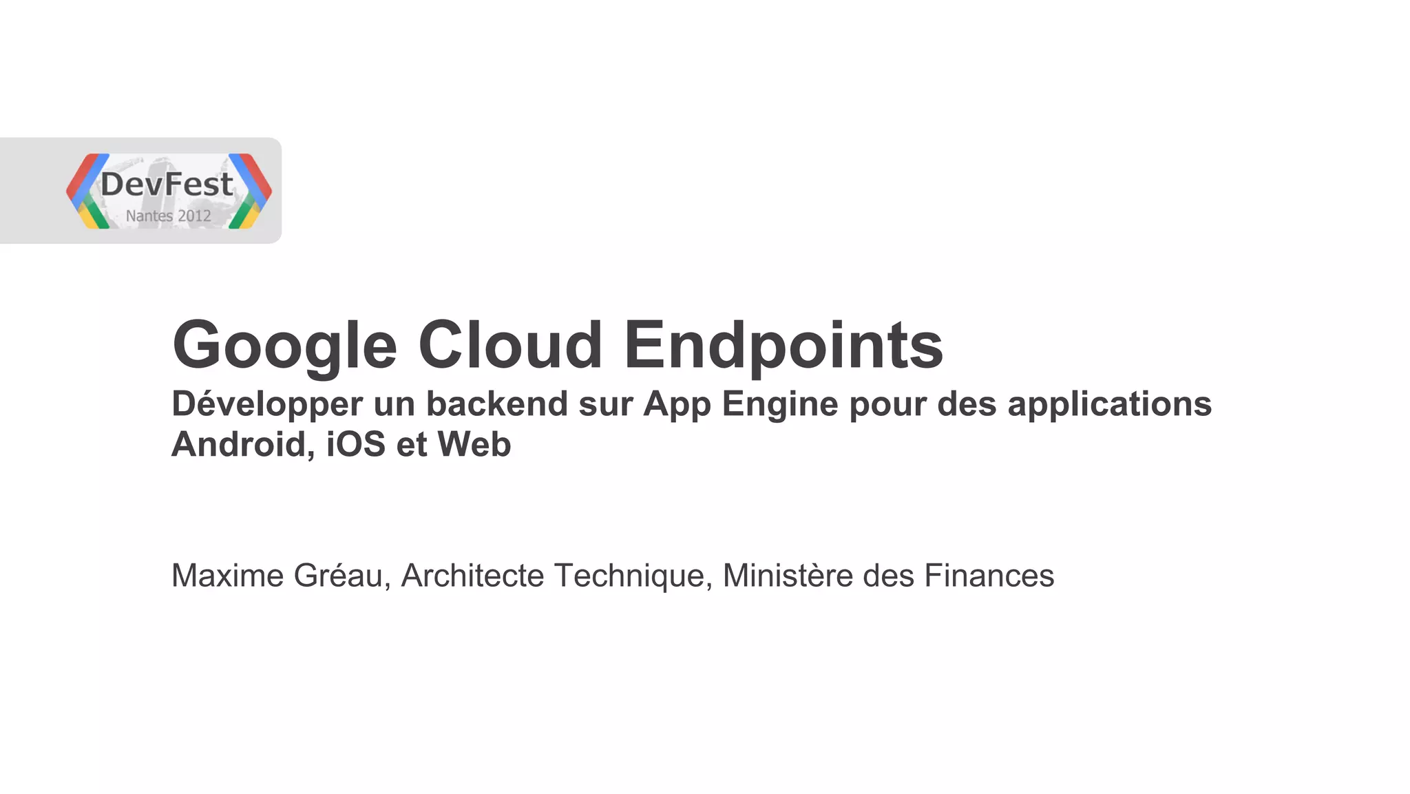 Le document présente l'utilisation de Google App Engine comme backend pour des applications multiplateformes, notamment Android, iOS et web. Il aborde les caractéristiques de Google Cloud Endpoints, qui facilite le développement d'APIs et l'interaction des applications clientes, tout en soulignant l'importance de la scalabilité et de la flexibilité. Différentes étapes de développement, de l'implémentation au déploiement, sont également détaillées pour illustrer le processus global.