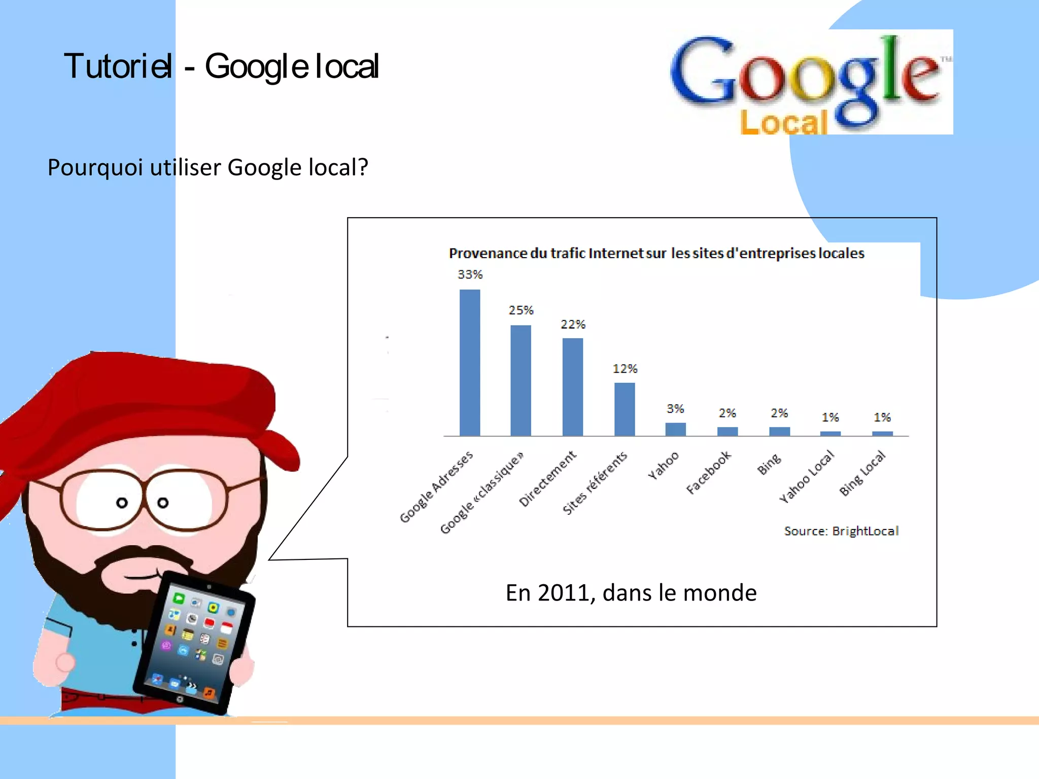 Ce tutoriel explique comment créer une fiche Google Local, incluant la création d'un compte Google et la géolocalisation de la fiche. Les étapes incluent la création du compte, la vérification de l'adresse e-mail et la validation de la fiche via un code reçu par courrier. Il fournit également des informations de contact pour l'animateur numérique de territoire de l'office de tourisme intercommunal du Pays d'Egletons.