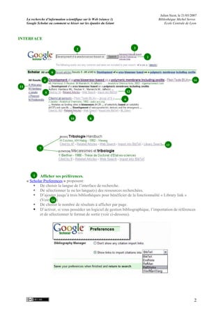 Le document présente un guide d'utilisation de Google Scholar, un outil de recherche d'informations scientifiques sur le web. Il décrit ses avantages, limitations, fonctionnalités de recherche avancée, ainsi que des conseils pour optimiser l'utilisation de la plateforme. L'accent est mis sur l'importance d'une recherche multidisciplinaire et de l'identification de l'impact des publications.