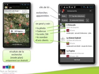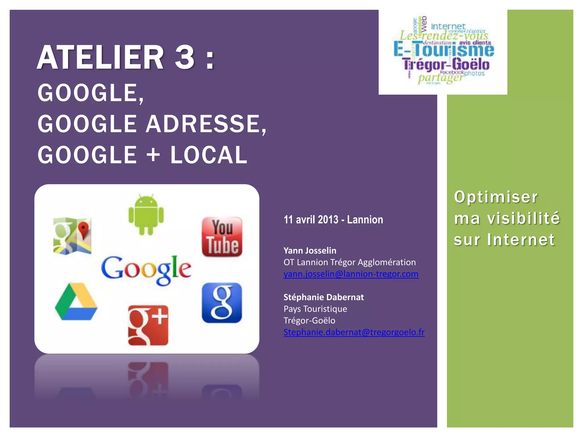 L'atelier du 11 avril 2013 à Lannion portant sur l'optimisation de la visibilité en ligne a présenté divers outils de Google, avec un accent particulier sur la transition de Google Adresse à Google + Local. Il a souligné l'importance de l'inscription des établissements sur Google + Local pour améliorer leur visibilité dans les résultats de recherche. Le document fournit également des étapes détaillées pour la création et la validation d'une page Google + pour les entreprises touristiques.
