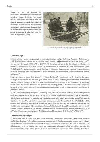Le goulag, système de camps de travail forcé en Union soviétique, a détenu entre 10 et 18 millions de personnes, dont beaucoup étaient des victimes du régime totalitaire. Historiquement obscurci par le régime soviétique, l'accès aux informations sur les goulags s'est amélioré après la glasnost, permettant aux chercheurs d'explorer les conditions de vie et la répression dans ces camps. Des débats historiographiques ont comparé les camps soviétiques et nazis, révélant des similarités et des différences significatives dans leurs objectifs et leurs traitements des détenus.