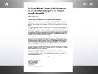 Le Grand Prix du Canada, tenu à Montréal depuis 1978, est un événement majeur avec des implications économiques et culturelles significatives. Des enjeux récents, tels que la pression des groupes environnementaux et les conflits d'organisation, remettent en question la pérennité de l'événement. Les recommandations incluent une meilleure utilisation des médias sociaux et l'amélioration des relations internes pour assurer la durabilité de l'événement.