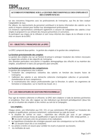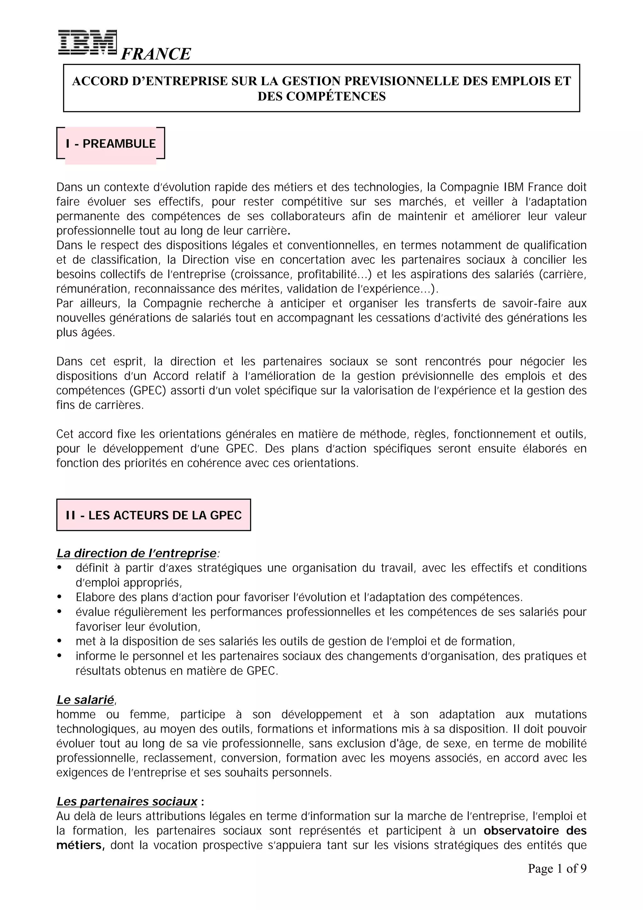 L'accord d'entreprise de la compagnie IBM France vise à améliorer la gestion prévisionnelle des emplois et des compétences (GPEC) pour s'adapter aux évolutions technologiques et des métiers, tout en conciliant les besoins de l'entreprise et les aspirations des salariés. Il inclut des objectifs, des principes, et des moyens pour gérer l'évolution des emplois et des compétences, en intégrant les salariés, la direction et les partenaires sociaux dans un processus participatif. Un observatoire des métiers sera mis en place pour anticiper les tendances du marché et évaluer l'impact des changements, tout en soutenant le développement professionnel des collaborateurs, notamment des seniors en fin de carrière.