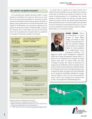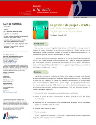 Le bulletin de l'Institut de développement de produits présente la gestion de projet 'lean', ses origines inspirées des méthodes de production de Toyota, et ses principes pour maximiser la valeur tout en minimisant les pertes. Il décrit également les deux principes fondamentaux et quatre outils clés pour appliquer cette approche dans la gestion des projets, soulignant l'importance de la participation continue des utilisateurs finaux. Le texte vise à sensibiliser les acteurs de projet au potentiel de la gestion 'lean' pour améliorer l'efficacité des processus de livraison.