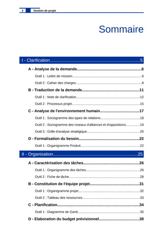 Ce document traite de la gestion de projet, détaillant les étapes clés telles que l'analyse de la demande, la formalisation du besoin, l'organisation, la réalisation et la clôture du projet. Il présente également divers outils et techniques, comme la lettre de mission et le cahier des charges, pour structurer et suivre l'avancement du projet. Une attention particulière est accordée à la communication entre les parties prenantes et à la prise en compte de l'environnement humain dans la gestion des changements induits par le projet.
