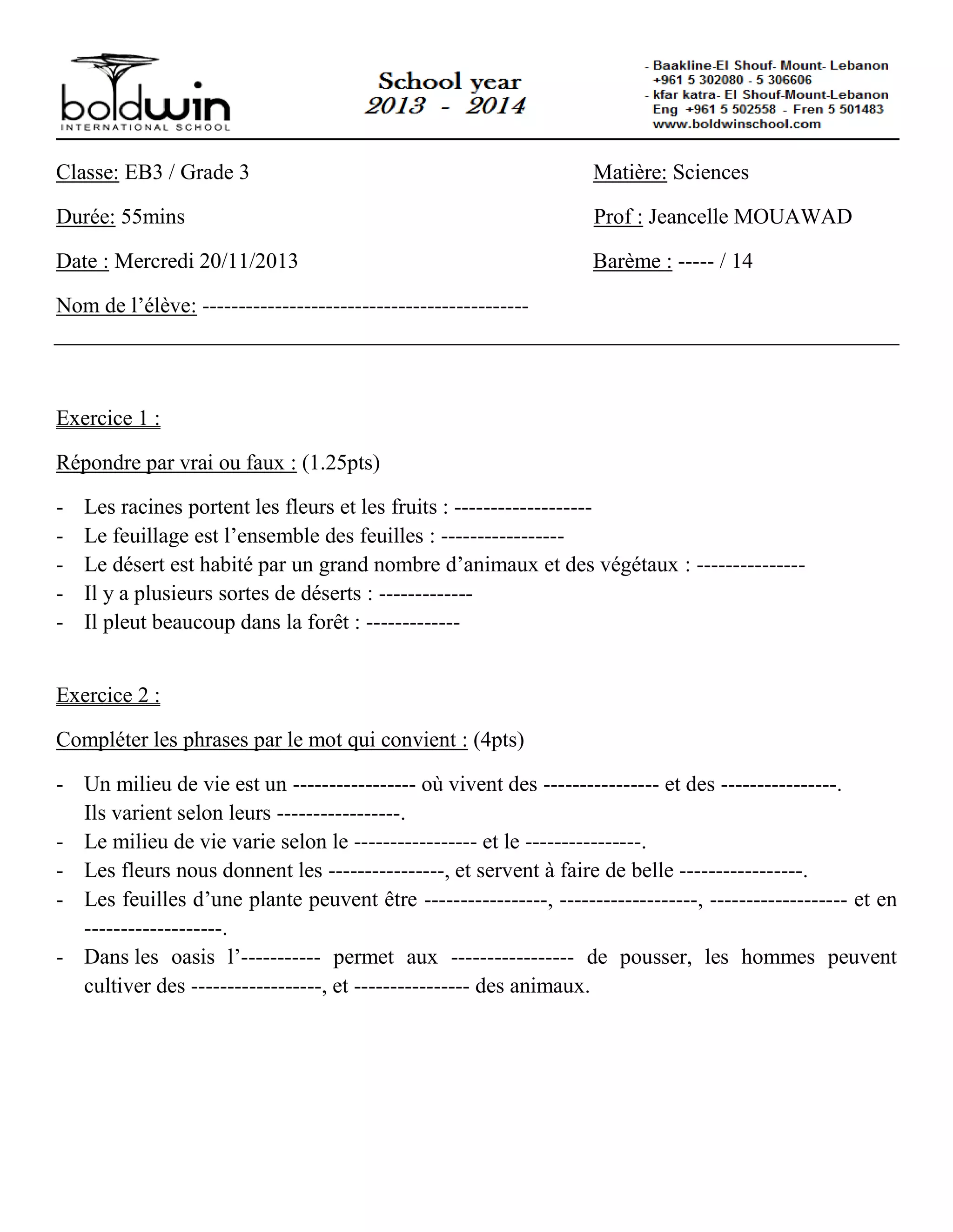 Le document présente un exercice scolaire de sciences pour des élèves de troisième année, portant sur les milieux de vie, les plantes et les animaux. Il inclut des questions de vrai ou faux, des complétions de phrases, des réponses à des questions ouvertes et un tableau à remplir. L'exercice encourage également les élèves à décrire un milieu de vie qu'ils aiment visiter.