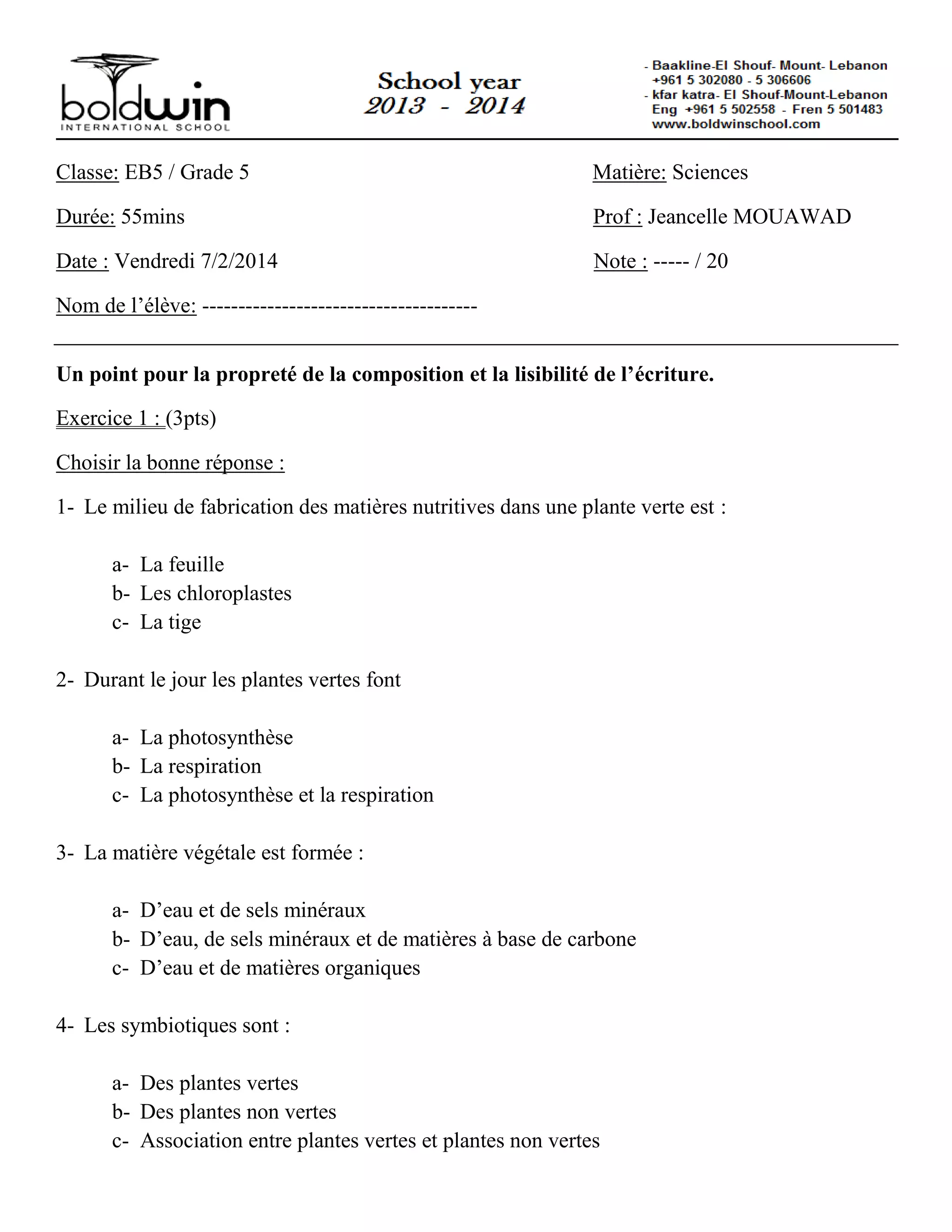 Le document est un examen de sciences pour les élèves de cinquième, comprenant plusieurs exercices sur la photosynthèse, les plantes vertes et non-vertes, ainsi que leurs modes de nutrition. Les questions incluent des choix multiples, des vraies ou fausses, et des explications écrites sur des concepts clés. L'évaluation met l'accent sur la propreté, la compréhension des matières nutritives des plantes et le cycle de l'oxygène dans la nature.