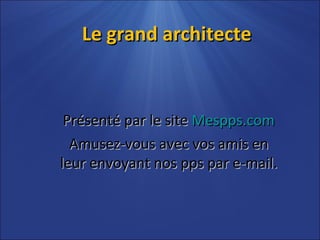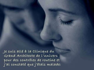 Le document décrit une visite médicale métaphorique chez le 'grand architecte', révélant divers maux émotionnels, tels que la solitude et la jalousie, représentés par des problèmes de santé. Le narrateur reçoit des prescriptions symboliques, comme des doses d'amour et de paix, pour soigner son cœur vide. Il conclut en rappelant l'importance de la méditation et en souhaitant que le 'grand architecte' guide chacun dans les moments difficiles.