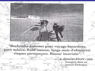 Le document évoque un voyage en Laponie et dans le Grand Nord, célèbre pour ses aurores boréales et le soleil de minuit. Il fait référence à l'explorateur polaire E. Shackleton et souligne que le bonheur réside dans le voyage plutôt que dans la destination. L'appel à l'aventure incite à se lancer dans cette exploration.