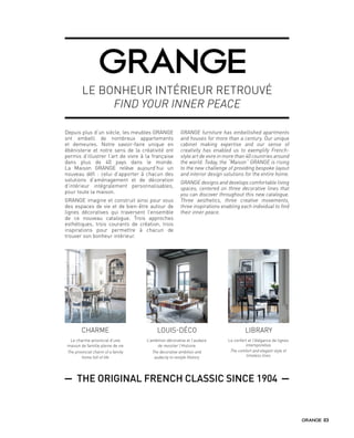 La maison Grange, forte d'un siècle d'expérience, propose des meubles et des solutions de décoration intérieure personnalisables, célébrant l'art de vivre à la française dans plus de 40 pays. Avec un savoir-faire en ébénisterie et une approche esthétique innovante, Grange offre des collections inspirées de l'histoire tout en restant contemporaines, permettant à chaque client de trouver son bonheur. Les conseillers en magasin assistent les clients dans le choix des finitions et des couleurs pour harmoniser les meubles avec leur intérieur.