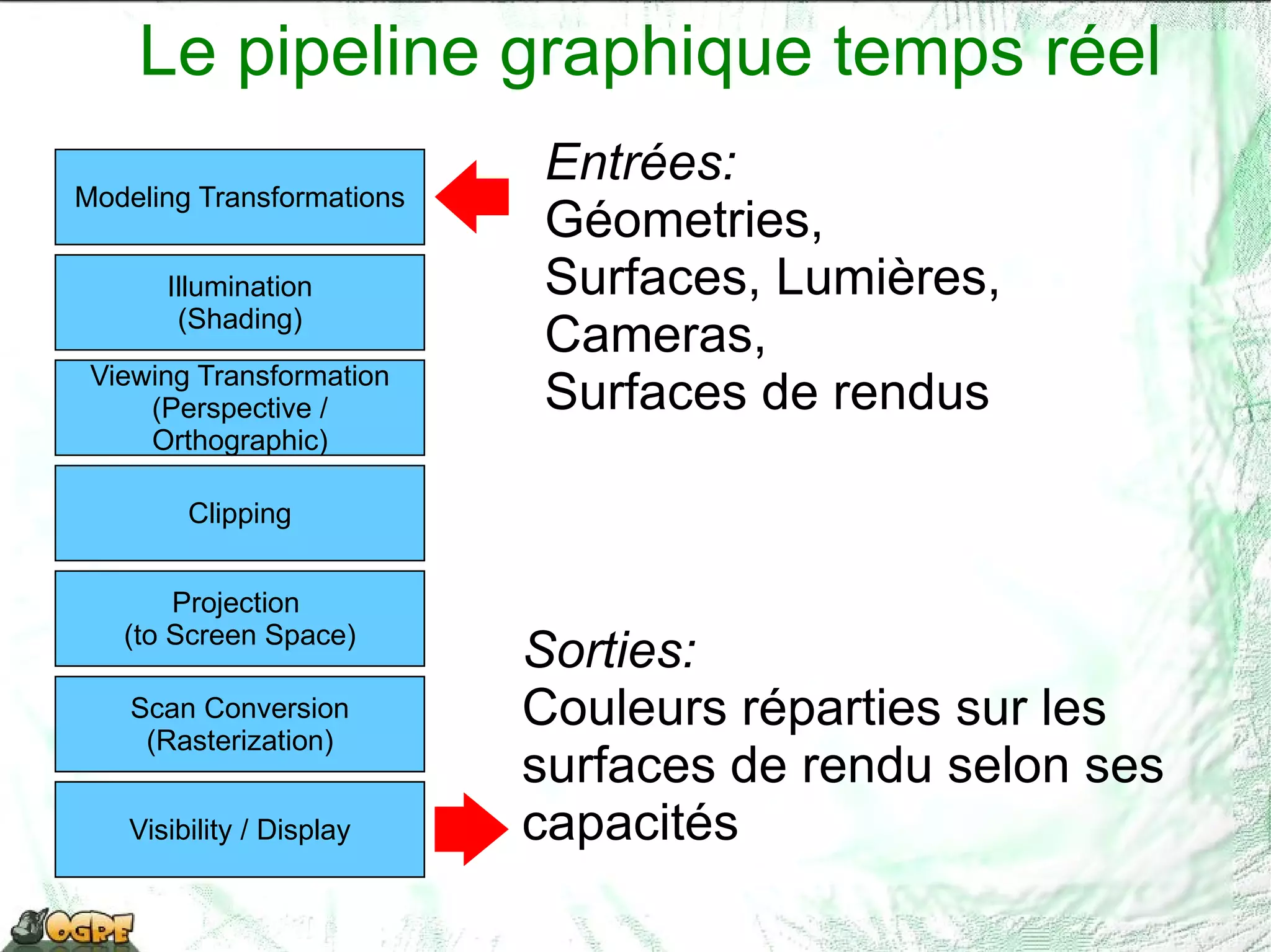 Le document décrit en détail le pipeline graphique en temps réel, incluant les étapes de transformation de modèles, d'illumination, de projection et de rasterisation. Il aborde les systèmes de coordonnées utilisés dans le rendu 3D et les algorithmes de visibilité comme le z-buffer. Enfin, il mentionne l'utilisation de shaders pour gérer les transformations et l'éclairage des objets en fonction des propriétés des matériaux et des lumières.