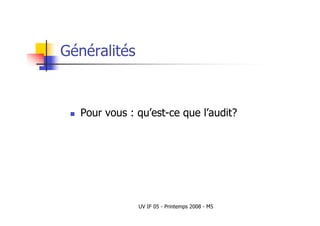 Le document décrit le processus d'audit qualité, incluant les étapes de préparation, réalisation et suivi, ainsi que les rôles des auditeurs. Il souligne l'importance des audits internes et externes pour évaluer la conformité aux normes et améliorer les processus au sein des organisations. Enfin, il aborde les compétences nécessaires pour les auditeurs, telles que l'écoute active et la formulation de questions appropriées.