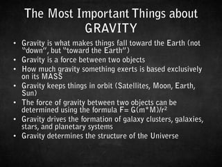 #5 So lets look at gravity through Newton’s laws. Gravity is something that changes somethings velocity, so if the apple is floating through space and it gets near a planet, the gravity of that planet will change the objects velocity, maybe even pull it in.Gravity makes a mass, like this apple, accelerate toward the object with the gravity.And finally, every action has an equal and opposite reaction….so if the Earth is pulling on this apple, the apple must be pulling on the Ear th! And it IS. We are each pulling on the Earth with the same force of gravity it is pulling on us. So gravity is a force between 2 objects, ANY two objects.