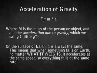 #8 So if we take Newton’s second, F = m times a, and we remember that the acceleration due to gravity is little g, we get this equation F sub g = mass times little g. And I told you already that for the surface of the Earth, little g is always the same. But how do we know how much this is? How do we know what the acceleration due to gravity is for me right now? It turns out that you can figure out g based only on two things, the mass of the object you are dealing with, in this case the mass of the planet Earth, and how far away you are from the center of that object you are, in this case, how far am I from the center of the Earth? Mass of the Earth is 5.97E24KgRadius of the Earth is 6.37E6m(6.67E-11N(m/kg)2 * 5.97E24kg) / (6.4E6m^2) = 9.72165527m/s2 which is about 10 m/s2So the acceleration due to gravity on Earth, at least at sea level, is about 10 m per second squared. Which means that if you drop something, ANYTHING, lets say I dropped this ball from the grand canyon, every second it will fall 10 meters/second faster than the second before. So the first second I drop it, it will be going about 10 meters per second. Then the next second it will be going 20 meters per second. And the next second it will be going 30 meters per second. Remember that acceleration describes how the velocity of something is CHANGING, not how fast something is going. Velocity is how fast something is going.