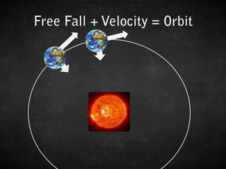 #5 So lets look at gravity through Newton’s laws. Gravity is something that changes somethings velocity, so if the apple is floating through space and it gets near a planet, the gravity of that planet will change the objects velocity, maybe even pull it in.Gravity makes a mass, like this apple, accelerate toward the object with the gravity.And finally, every action has an equal and opposite reaction….so if the Earth is pulling on this apple, the apple must be pulling on the Ear th! And it IS. We are each pulling on the Earth with the same force of gravity it is pulling on us. So gravity is a force between 2 objects, ANY two objects.