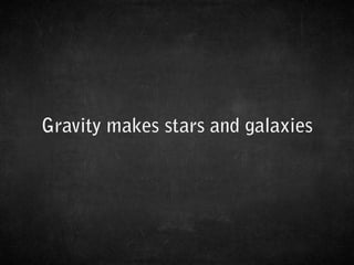 #18 In fact, gravity is the reason that there are galaxies and stars at all! Stars are formed when gas is attracted to other gas by gravity, and galaxies are formed when stars are attracted to each other, and to black holes, and to more gas, all by gravity!