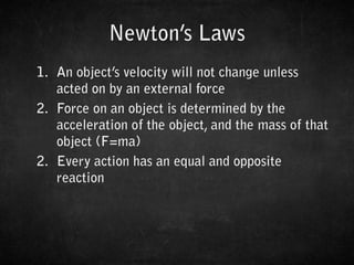 #5 So lets look at gravity through Newton’s laws. Gravity is something that changes somethings velocity, so if the apple is floating through space and it gets near a planet, the gravity of that planet will change the objects velocity, maybe even pull it in.Gravity makes a mass, like this apple, accelerate toward the object with the gravity.And finally, every action has an equal and opposite reaction….so if the Earth is pulling on this apple, the apple must be pulling on the Ear th! And it IS. We are each pulling on the Earth with the same force of gravity it is pulling on us. So gravity is a force between 2 objects, ANY two objects.