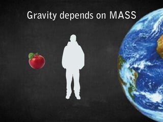 #5 So lets look at gravity through Newton’s laws. Gravity is something that changes somethings velocity, so if the apple is floating through space and it gets near a planet, the gravity of that planet will change the objects velocity, maybe even pull it in.Gravity makes a mass, like this apple, accelerate toward the object with the gravity.And finally, every action has an equal and opposite reaction….so if the Earth is pulling on this apple, the apple must be pulling on the Ear th! And it IS. We are each pulling on the Earth with the same force of gravity it is pulling on us. So gravity is a force between 2 objects, ANY two objects.