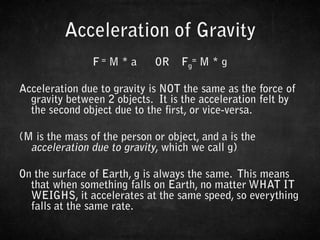 #5 So lets look at gravity through Newton’s laws. Gravity is something that changes somethings velocity, so if the apple is floating through space and it gets near a planet, the gravity of that planet will change the objects velocity, maybe even pull it in.Gravity makes a mass, like this apple, accelerate toward the object with the gravity.And finally, every action has an equal and opposite reaction….so if the Earth is pulling on this apple, the apple must be pulling on the Ear th! And it IS. We are each pulling on the Earth with the same force of gravity it is pulling on us. So gravity is a force between 2 objects, ANY two objects.