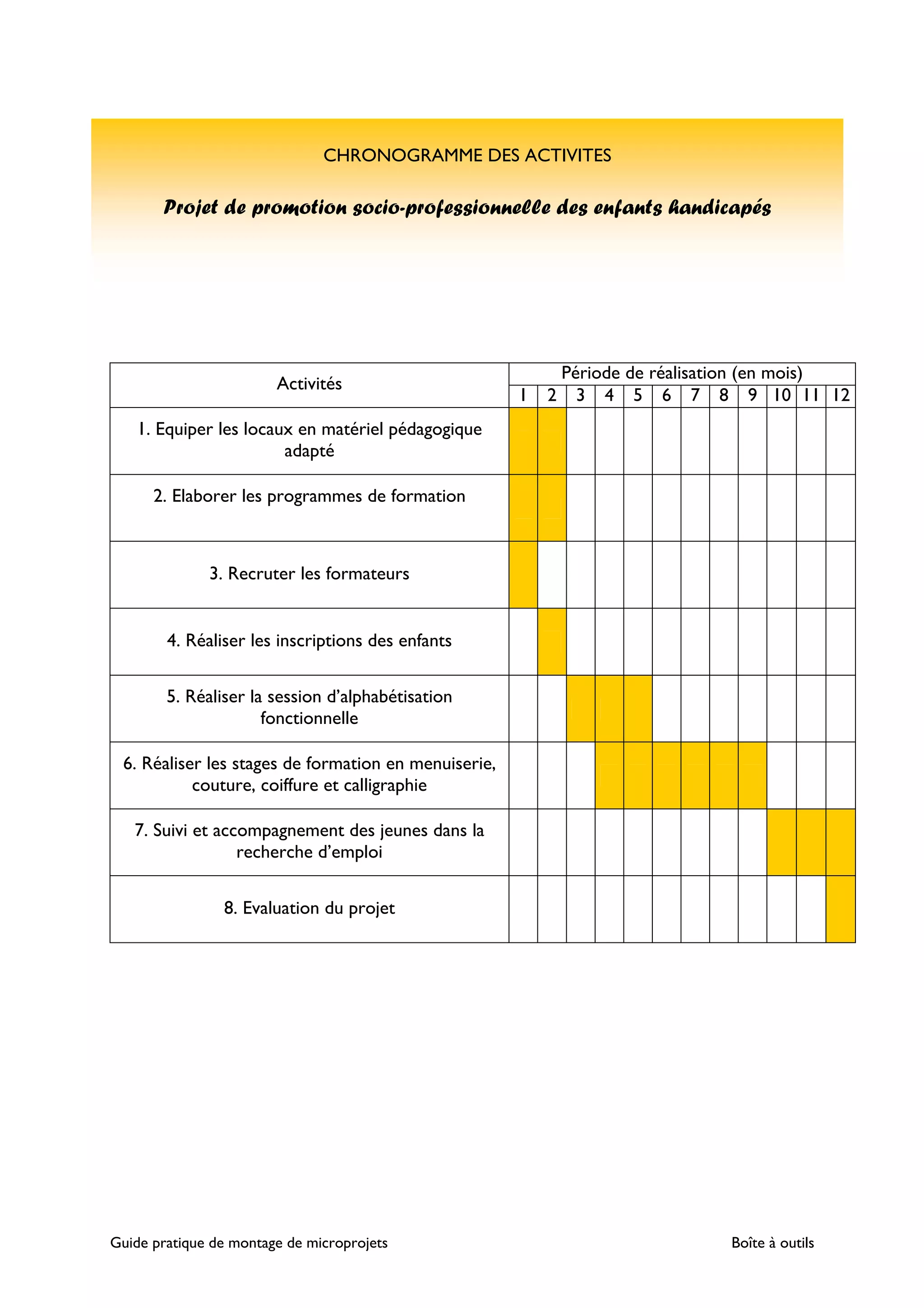 Le document présente un chronogramme pour un projet de promotion socio-professionnelle des enfants handicapés, incluant des activités sur une période de 12 mois. Les principales actions consistent à équiper les locaux, élaborer des programmes, recruter des formateurs et offrir des formations diverses. Il est également prévu un suivi des jeunes dans leur recherche d'emploi et une évaluation du projet.