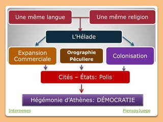 La Grèce antique, organisée en petites cités-états appelées polis, a été le berceau de la démocratie et de la culture occidentale. Sous l'hégémonie d'Athènes, des réformes politiques ont permis la participation des citoyens libres, bien que cette participation soit limitée aux hommes nés de parents citoyens. La Grèce a également fait des avancées significatives dans la philosophie, les arts, et les sciences, avec des figures emblématiques comme Socrate, Platon et Archimède.