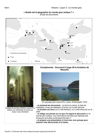 Le document présente le monde grec antique à travers plusieurs leçons, abordant la géographie, la vie quotidienne, la religion, l'art et la mythologie des Grecs anciens. Chaque leçon se compose d'études de documents iconographiques, de leur description, de l'analyse de leur contenu et de la préparation d'une présentation orale. Les élèves sont également invités à vérifier la pertinence des informations par rapport à des références culturelles contemporaines, comme l'épisode des Simpsons.