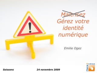 Le document aborde la gestion de l'identité numérique et de la réputation en ligne dans un monde de plus en plus transparent grâce au Web 2.0. Il traite des enjeux pour les individus et les entreprises, y compris l'impact des médias sociaux sur la réputation et la nécessité de surveiller son image en ligne. Des exemples de bad buzz illustrent comment une mauvaise gestion peut entraîner des conséquences désastreuses, tout en présentant des stratégies pour développer une marque personnelle ou d'entreprise.