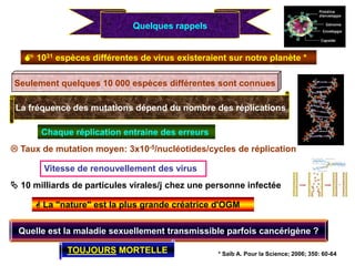 Le document discute des virus de la grippe, en particulier le H1N1, en soulignant leurs caractéristiques, leur fréquence de mutation, et les risques de pandémies. Il présente également les symptômes, le diagnostic, et la prise en charge clinique des cas de grippe, ainsi que les facteurs de risque associés. La grippe H1N1, qui a émergé en 2009, a le potentiel d'affecter des millions de personnes à l'échelle mondiale, avec des taux de mortalité notables, en particulier parmi les populations vulnérables.